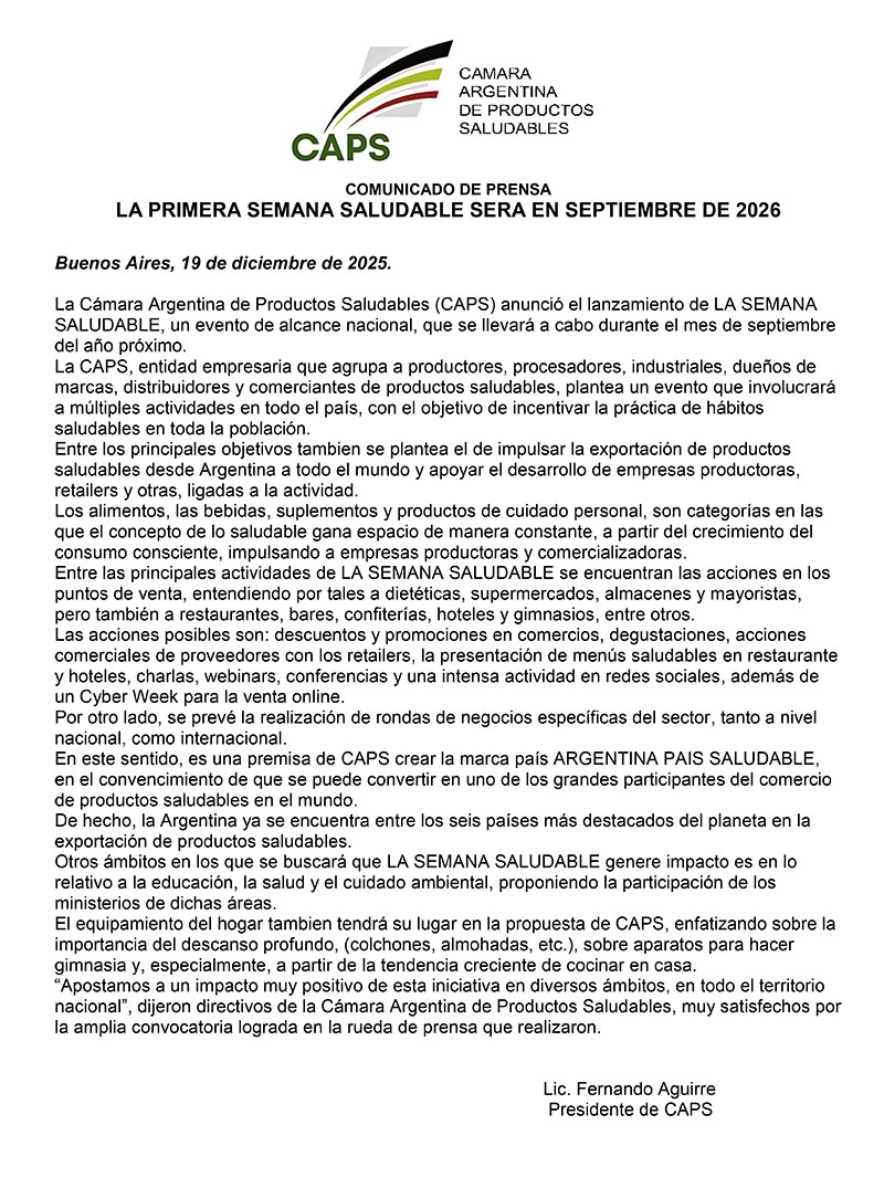 PRENSASEMANA SALUDABLE EN SEPTIEMBRE DE 2026 a00212944 meses atrás4 meses atrás01 min Navegación de entradas Anterior: CAPS: UNA CAMARA QUE SIGUE CRECIENDOSiguiente: CAMARA ARGENTINA DE PRODUCTOS SALUDABLES (CAPS) Deja una respuesta Cancelar la respuestaTu dirección de correo electrónico no será publicada. Los campos obligatorios están marcados con *Comentario * Nombre * Correo electrónico * Web